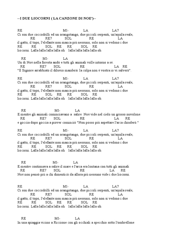 Testo Della Canzone I Due Liocorni. E così l'arca parte, e nessuno saprà più che fine hanno fatto! Due coccodrilli, un orangotango, due piccoli serpenti, un'aquila reale, il gatto, il topo, l'elefante, ma mancano appunto due animali…
