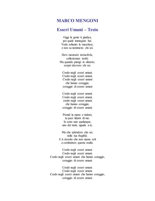 Esseri Umani Marco Mengoni from cdn.slidesharecdn.com La casa discografica rimane la stessa ma sono cambiati i suoi collaboratori, scelti dallo stesso mengoni e tutti giovanissimi. Di seguito il testo della canzone di marco mengoni. Vede soltanto le maschere, e non sa nemmeno chi sei.