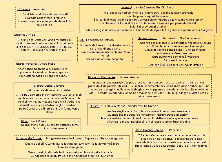 Www Sergioendrigo It Discografia Italia Anni 60 Lpb 35037 from www.sergioendrigo.it Lunga e diritta correva la strada l'auto veloce correva la dolce estate era già cominciata. E' l'amico e' una persona schietta come te che non fa prediche e non ti giudica tra lui e te e' divisa in due la stessa anima pero' lui sa, l'amico sa il gusto amaro della verita' ma sa nasconderla e per difenderti un vero amico e' anche un bugiardo e', l'amico e' qualcosa che piu' ce. Come avrete già potuto notare attraverso il titolo stesso della guida, andremo a spiegarvi come scrivere un testo di una canzone.