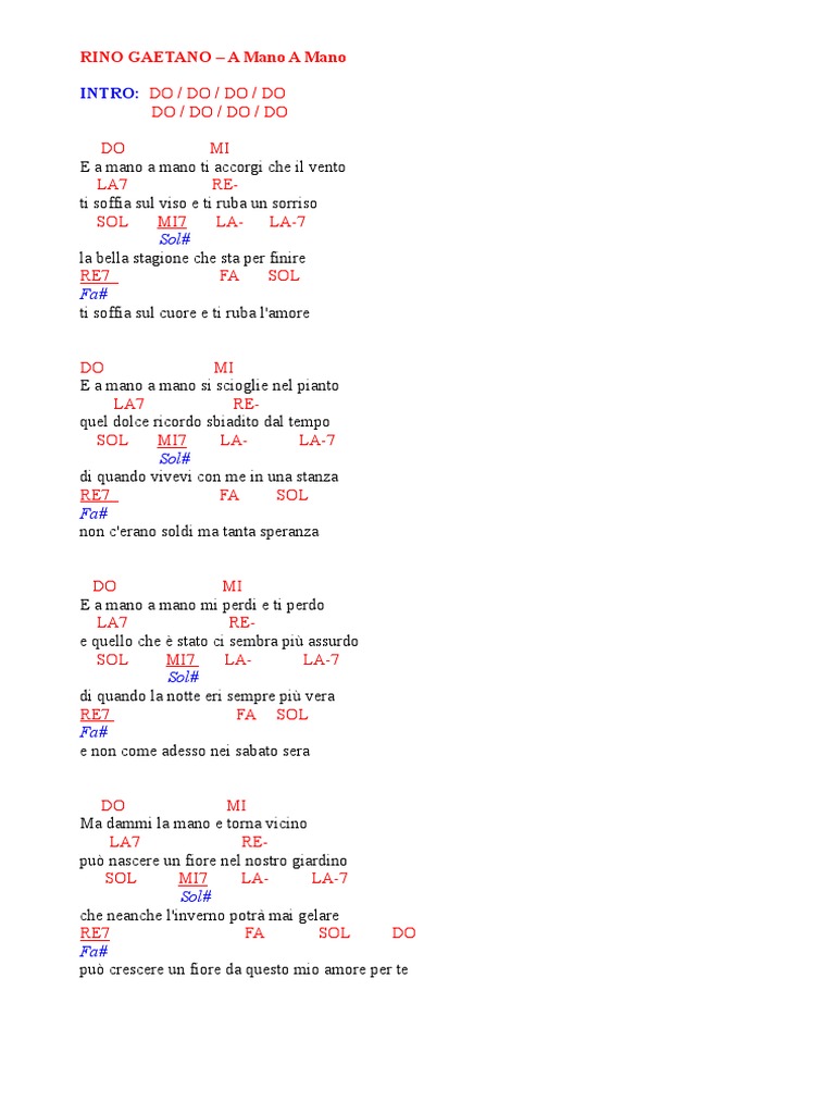 Testo Della Canzone A Mano A Mano. A mano a mano è una canzone e un successo straordinario e immortale di riccardo cocciante, interpretato da rino gaetano.la traccia torna a rivivere in un videoclip che mostra al meglio il talento interpretativo dell'artista romano scomparso nel 1981. Il testo della canzone a mano a mano parla di un amore ormai terminato, tuttavia questo amore è evidentemente stato troppo forte per potere essere davvero.