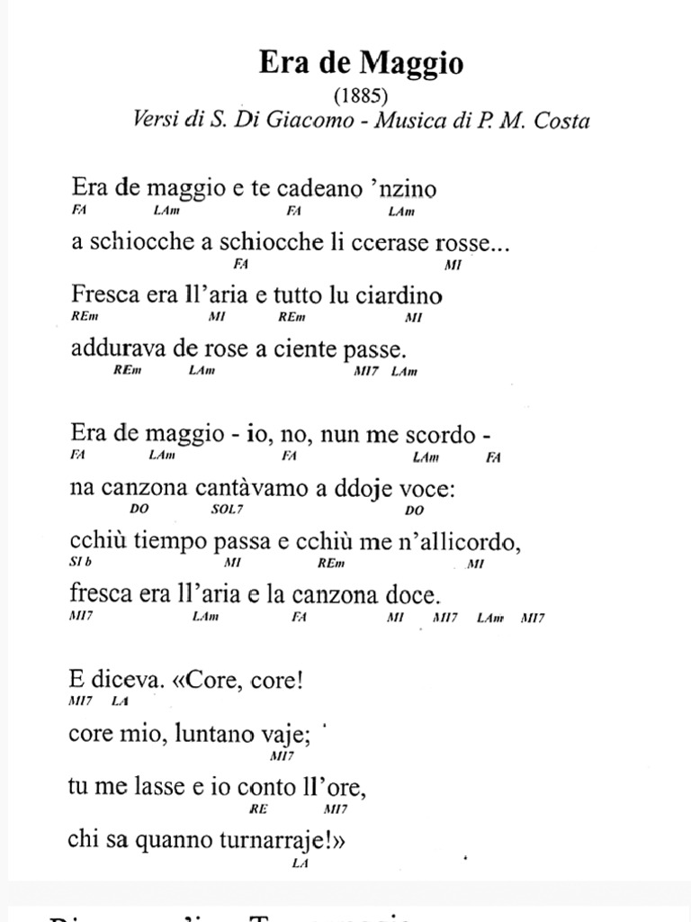 Testo Della Canzone Era Di Maggio. Cchiù tiempo passa e cchiù mme n'allicordo, fresca era ll'aria e la canzona doce. Anche se il nostro maggio ha fatto a meno del vostro coraggio se la paura di guardare vi ha fatto chinare il mento se il fuoco ha risparmiato le vostre millecento anche se voi vi credete assolti siete lo stesso coinvolti.e se.