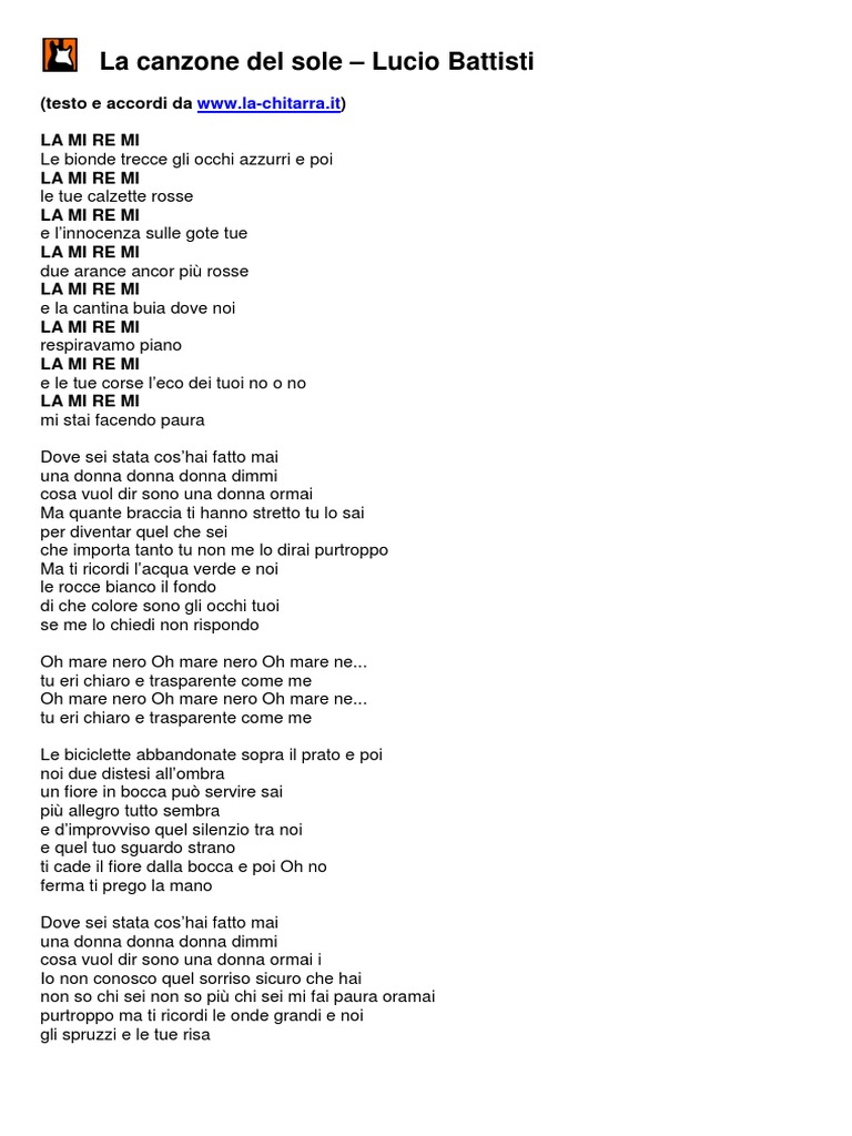 20 Canzoni Dedicate O Ispirate Al Sole Youdem from www.youdem.it E' una delle prime canzoni che di solito strimpella ai primordi chi vuole imparare a suonare la chitarra. Si mette in evidenza il cambiamento fisico e psicologico, contrastando l'innocenza che caratterizzava i loro incontri da bambini con i sentimenti più adulti del la canzone del sole ha avuto numerose cover eseguite da altri artisti Testo la canzone del sole.