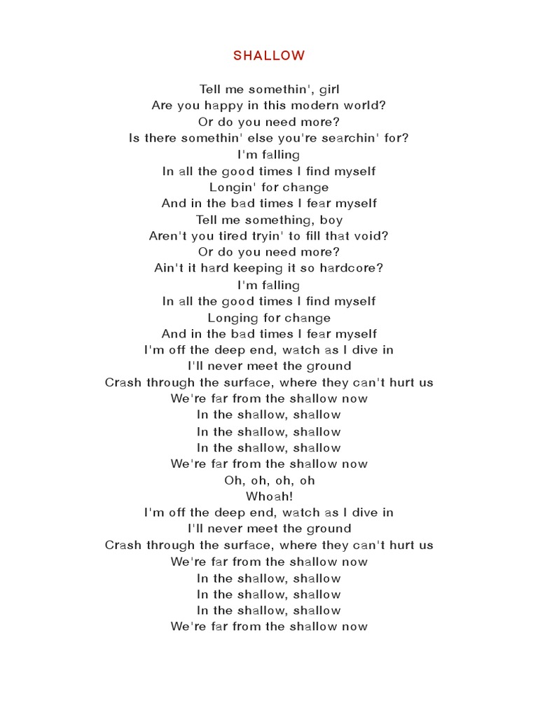 Testo Della Canzone Shallow. Richiedi la trascrizione di un testo. Avvia una discussione nel forum.