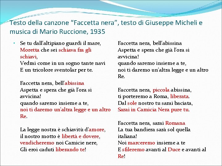 Il testo della della canzone di: È la storia di una donna napoletana che mette al mondo un bambino di colore ( sono gli anni in cui è forte la presenza degli americani nella città partenopea). Faccetta nera, bell'abissina aspetta e spera che già l'ora si avvicina! Andare a fondo insieme dentro a un altro shot.