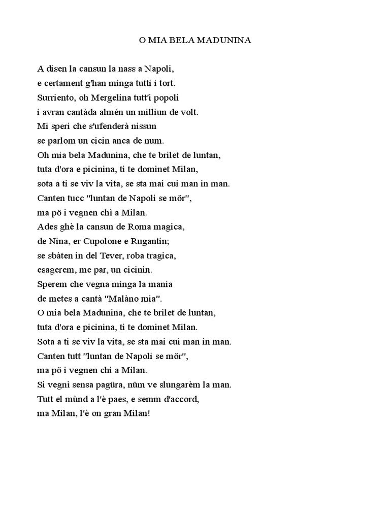 Testo Della Canzone O Mia Bela Madunina. O mia bela madunina che te brillet de lontan. Tuta d'ora e piscinina, ti te dominet milan.